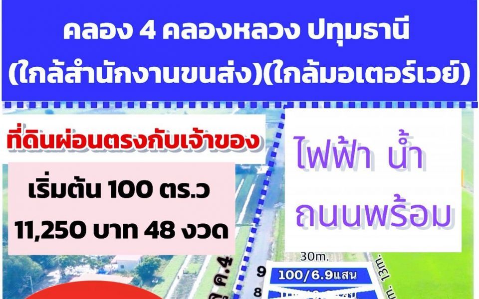 ✅100 ตร.ว 690,000(ดาวน์ 150,000)(ผ่อน 11,250)48 งวด ✅150 ตรว. 1.035 ล้าน (ดาวน์ 220,000) (ผ่อน 16,980)48 งวด ✅200 ตรว. 1.38 ล้าน (ดาวน์ 300,000) (ผ่อน 22,500)48 งวด ✅1 ไร่ 2.76 ล้าน (ดาวน์ 800,000) (ผ่อน 40,833)48 งวด